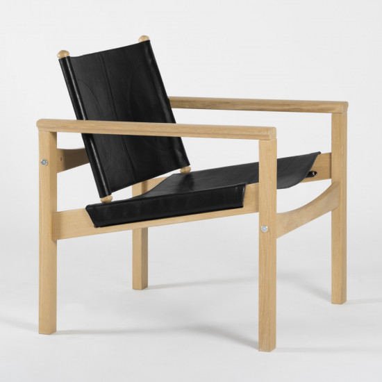 • Peglev Armchair - Matte black leather - Solid oak - front view